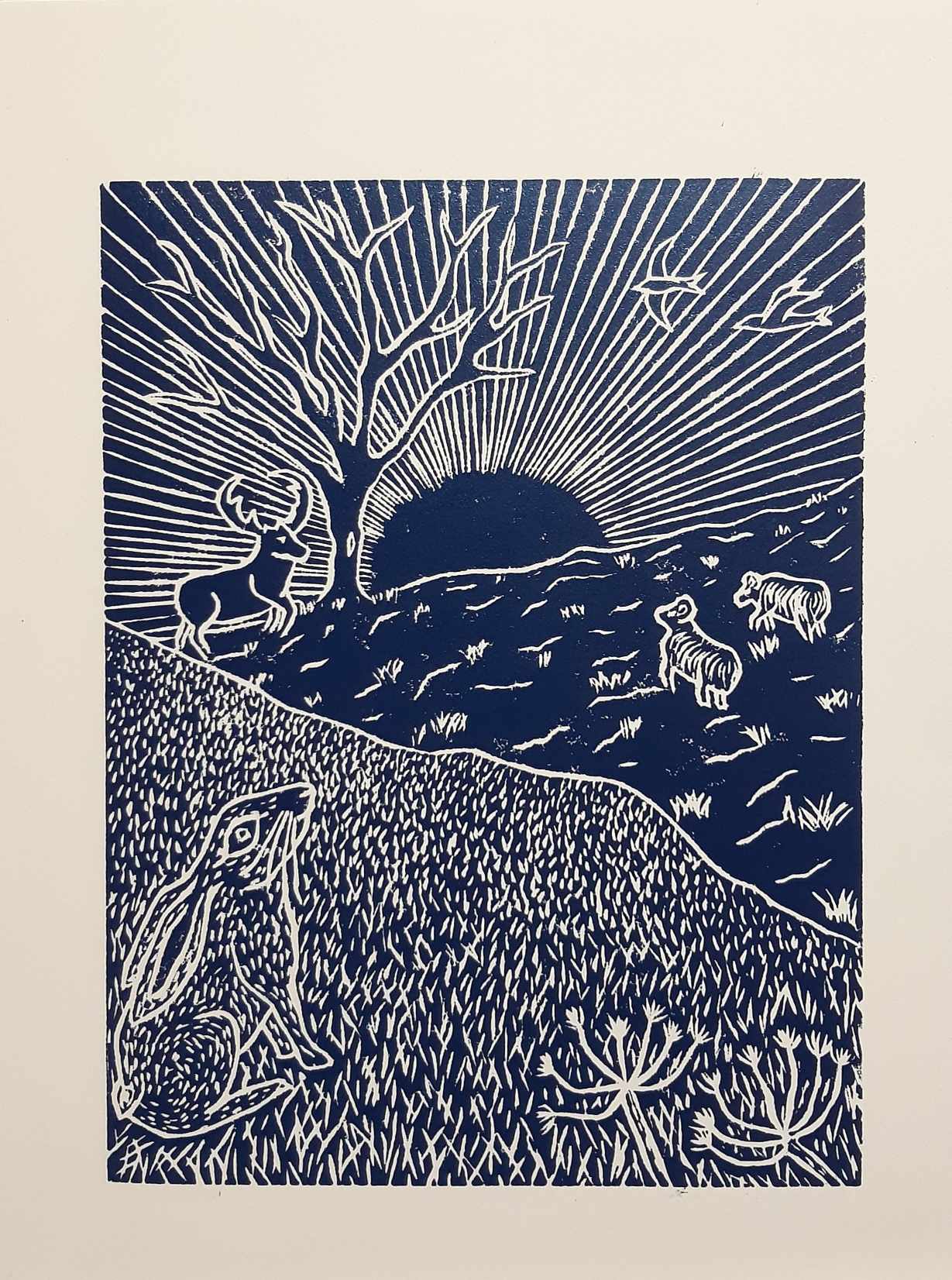 This lovely lino print showcases a hare, stag and sheep watching the majestic sunrise on a Lancashire fell.