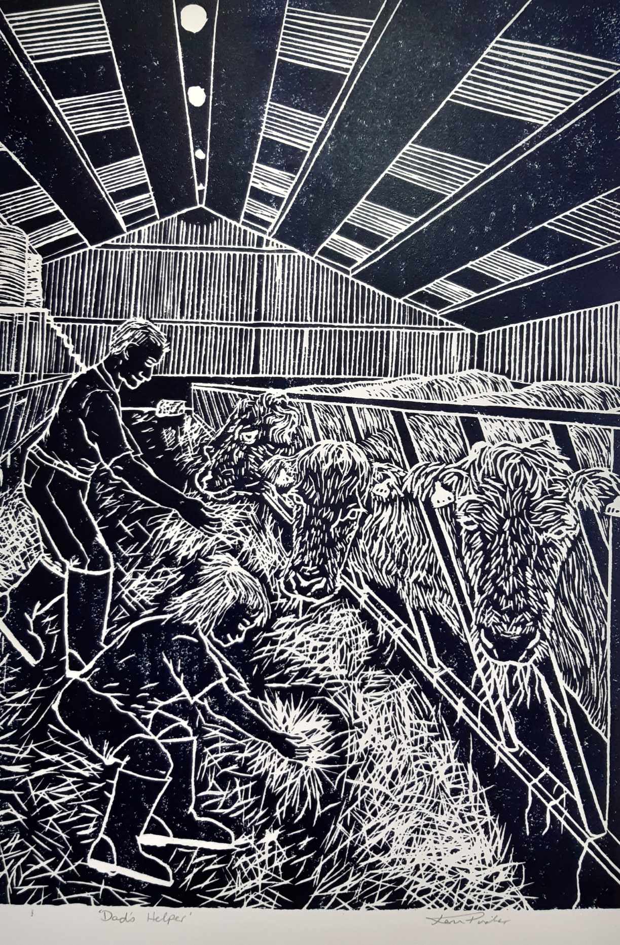 It's feeding time...This artwork showcases a young girl helping her Dad feed the cows and clean up the shed.