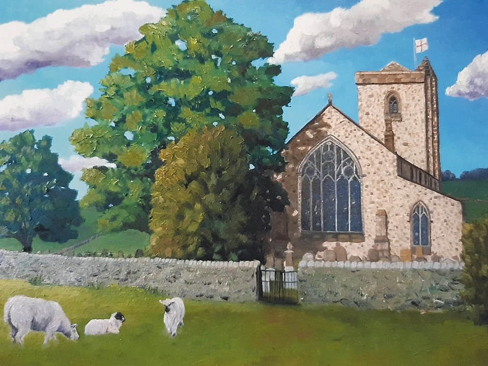 St. Andrew's Church in Slaidburn is one of the most beautiful churches in Lancashire! Behind the church, is the River Hodder and fields full of sheep and lambs. This oil painting is of a view of the Church that is not seen from the main road.