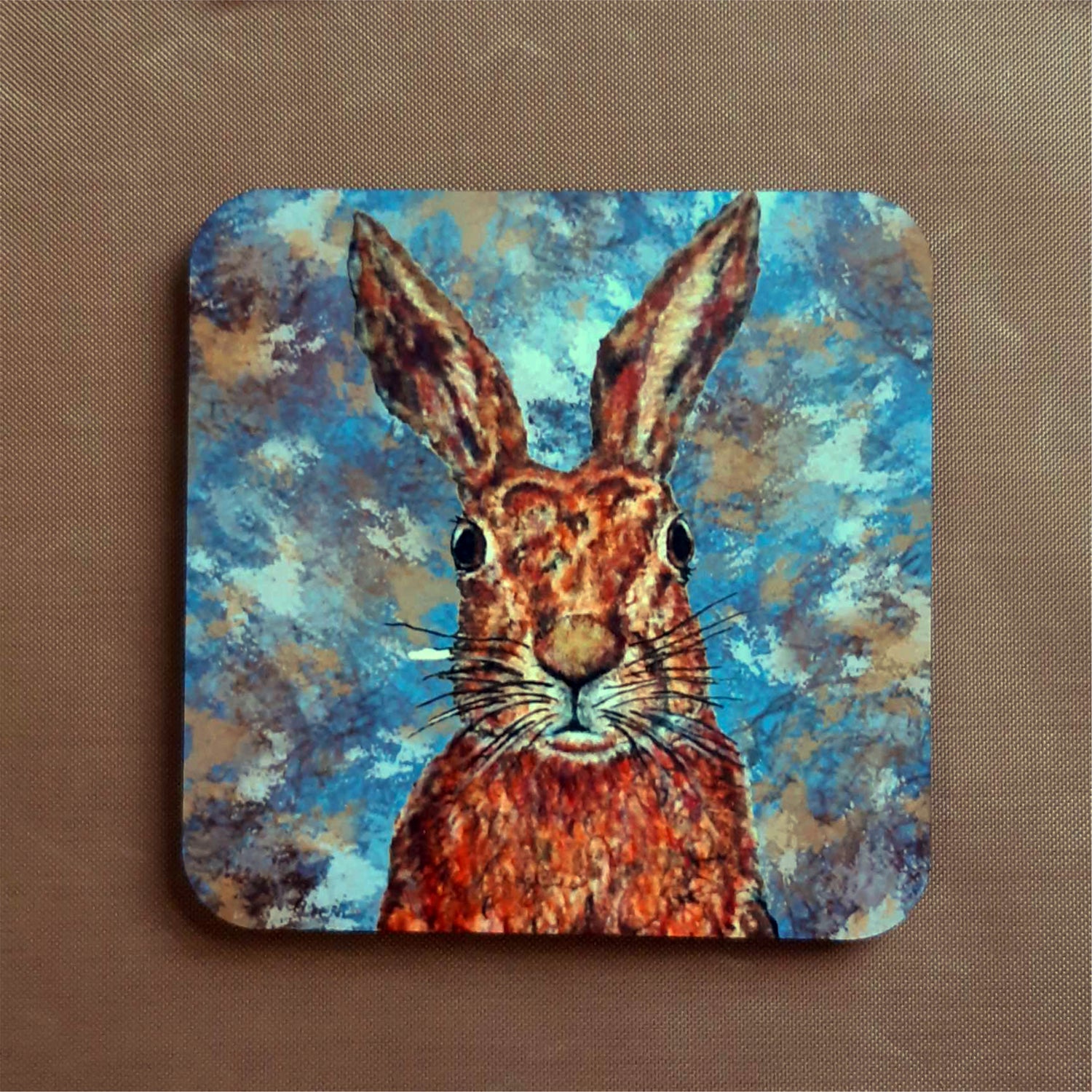 There's something special about hares! This alert and sprightly hare is featured with a bright and colourful abstract background.