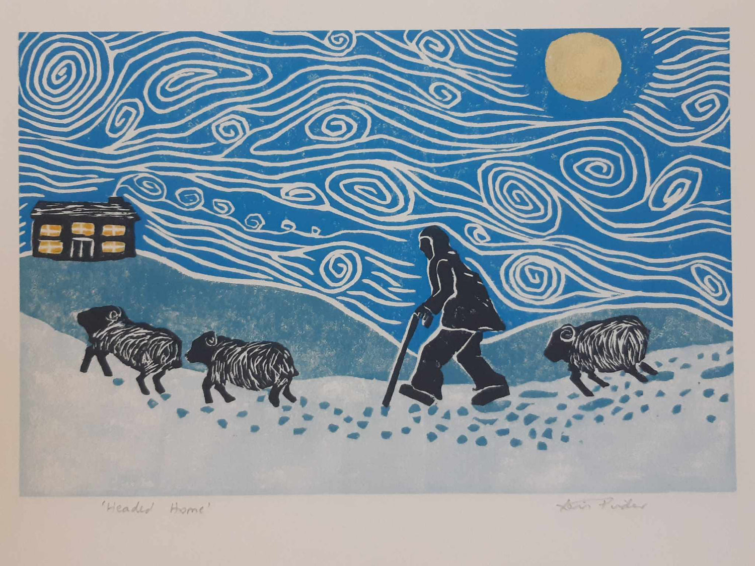 This multi-block lino print is of a weary and cold shepherd is leading his flock back home, on a cold wintry night.