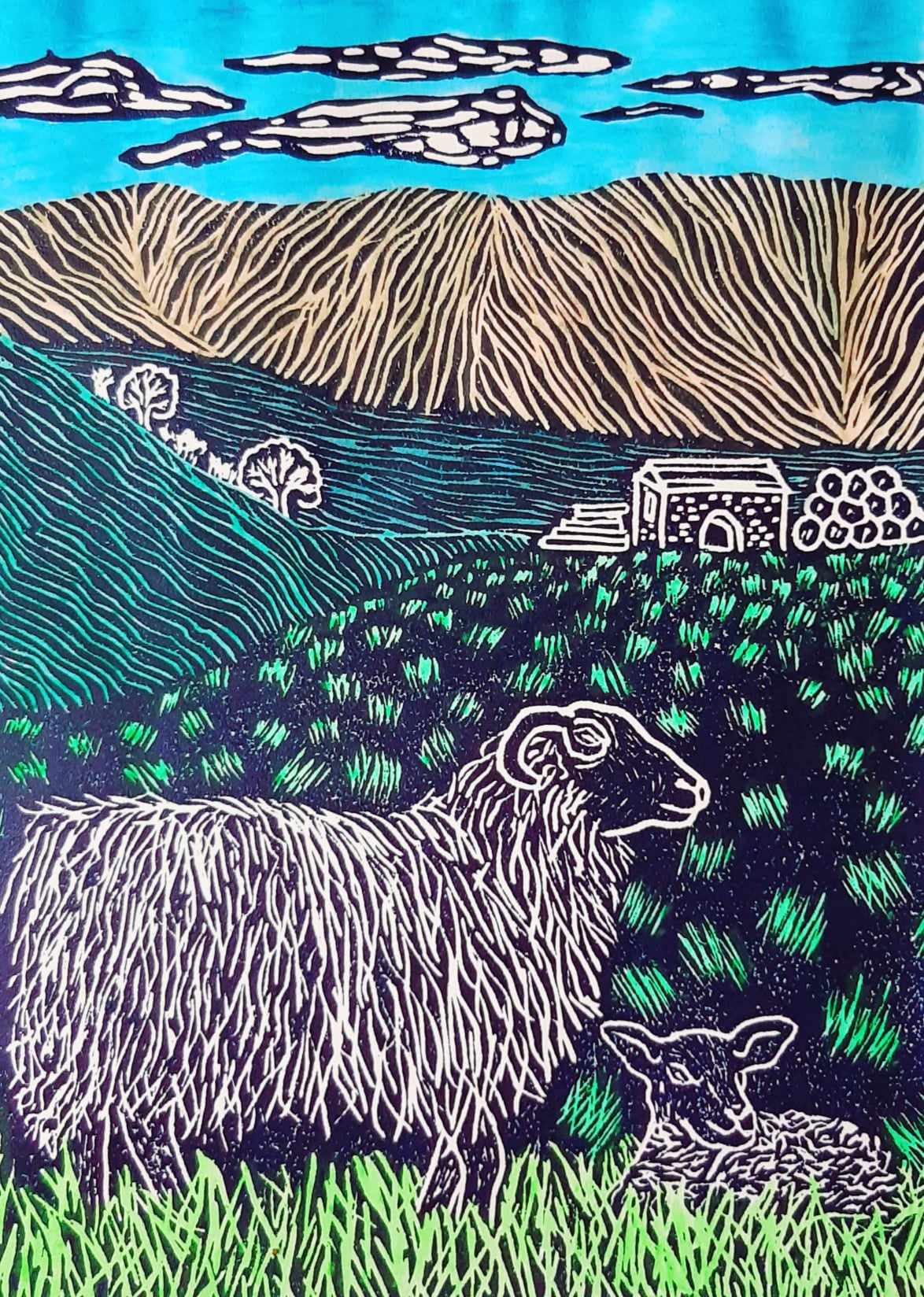 This bright and colourful lino print and watercolour showcases a beautiful Ewe and her lamb in the grass, with the fields and the fell in the background.