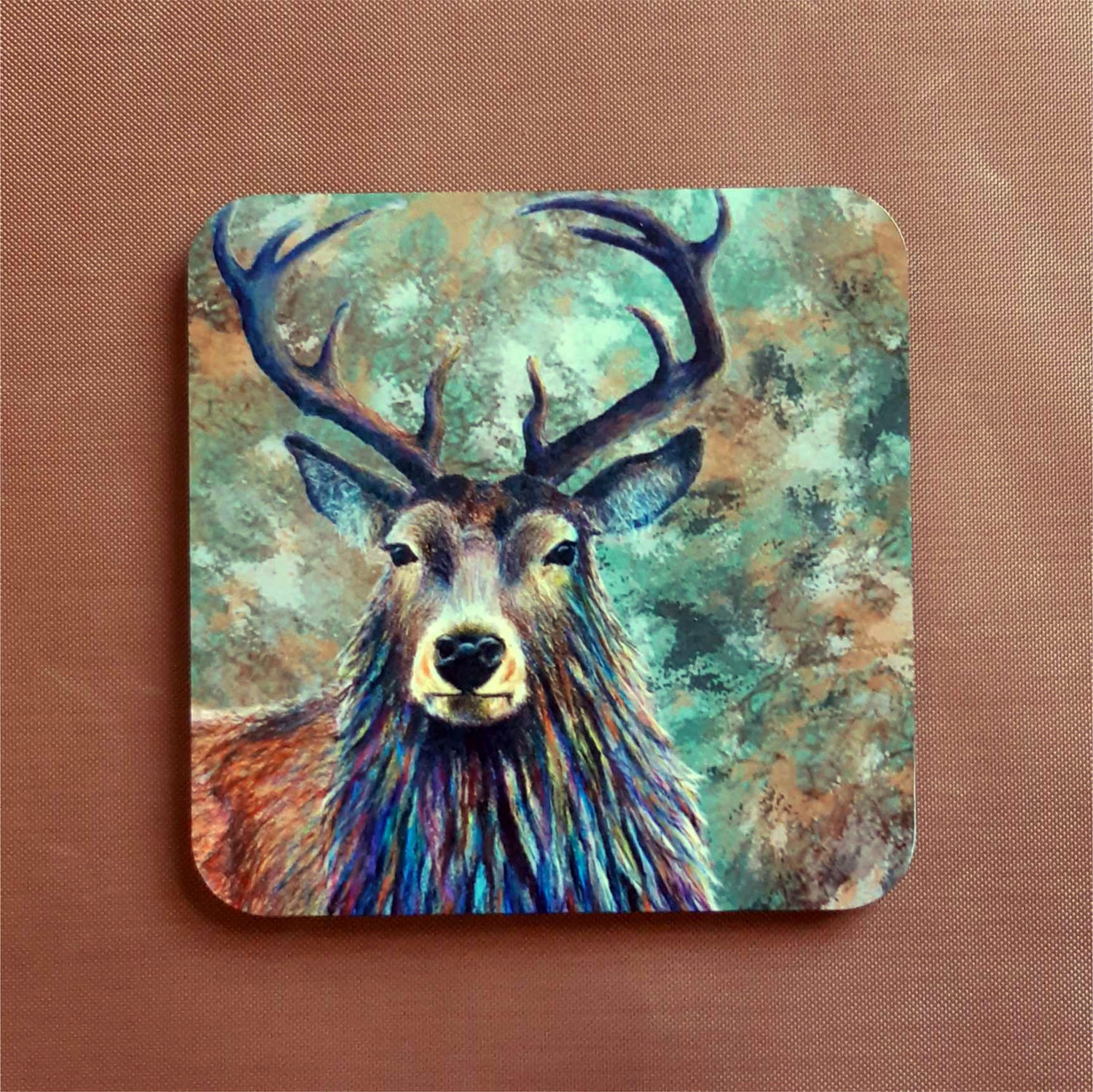 This beautiful set of four square gloss coasters showcase a majestic stag in the forest with an abstract forest background.