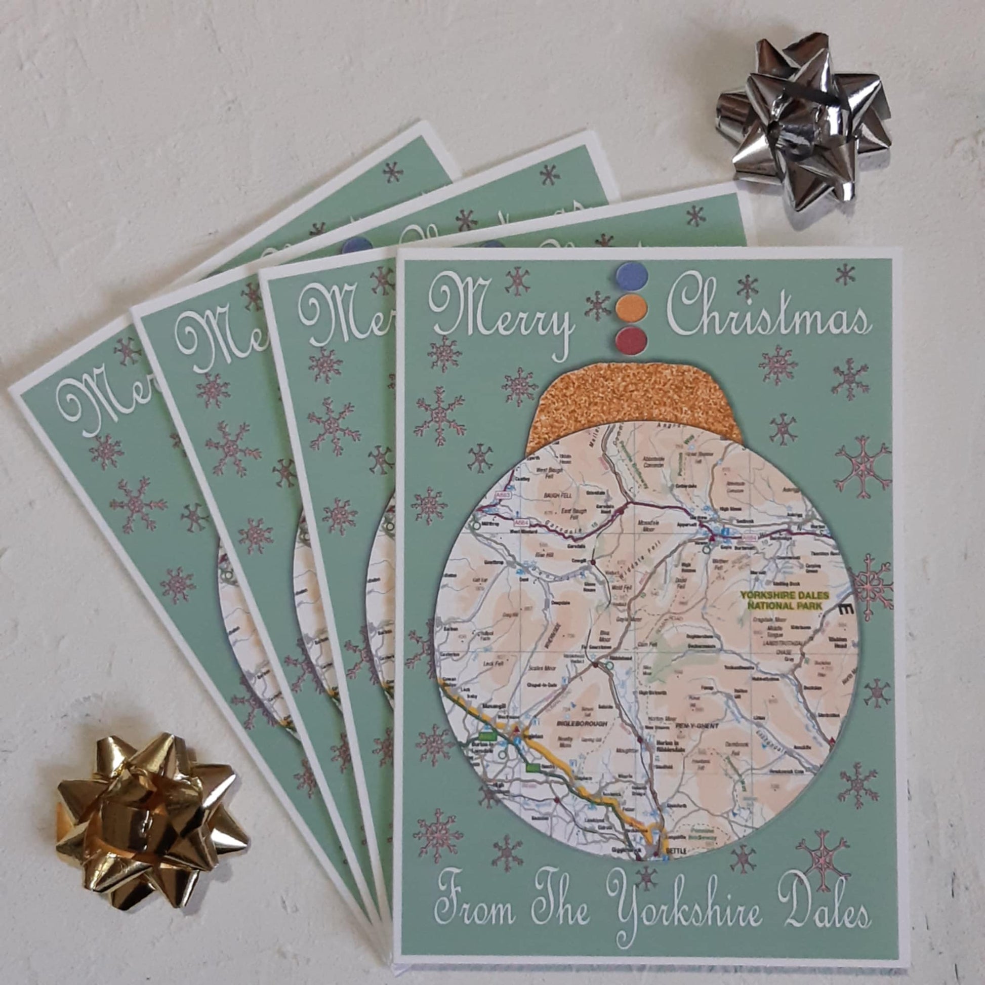 This 4 pack of lovely and unique Yorkshire Dales map Christmas cards contain 1 design. This Christmas bauble Christmas card showcases a OS Map of various parts of the Yorkshire Dales - 3 Peaks, Ingleton, Hawes, Horton-In-Ribblesdale.